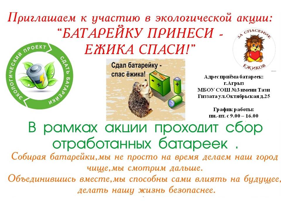 Экологическая акция "Батарейку принеси- ёжика спаси!" 16.04.2019
