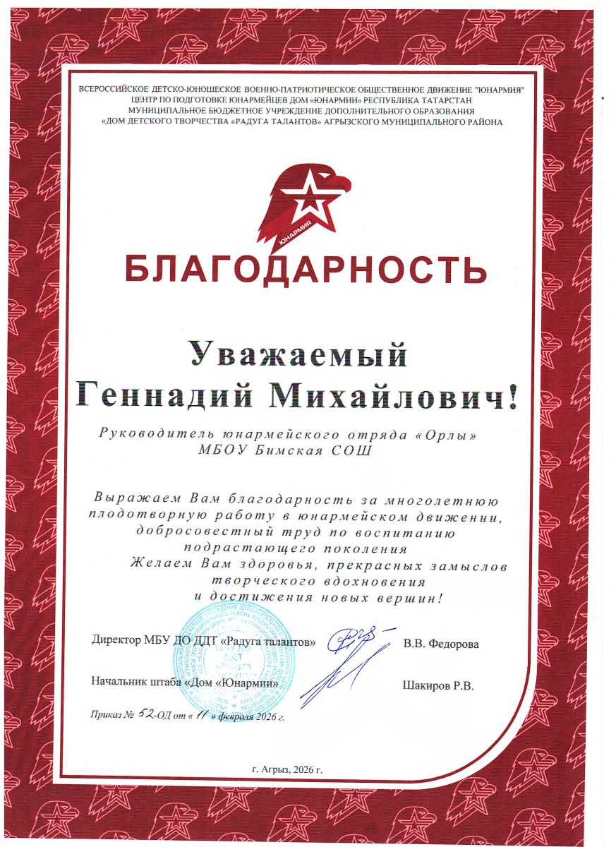 Благодарность руководителю Отряда юнармии 2026