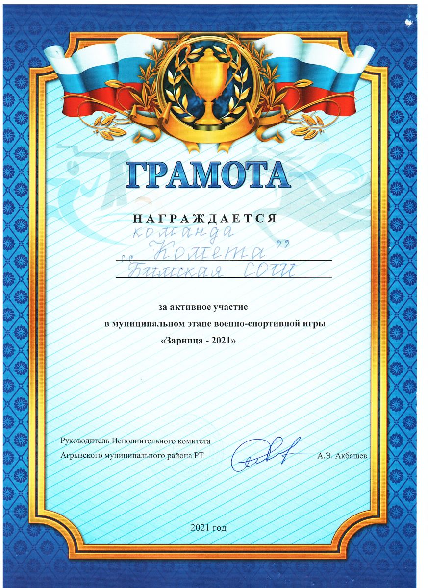 грамота за активное участие зарница