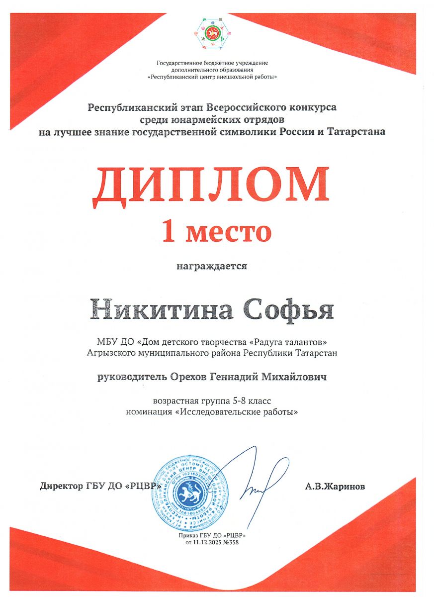 Диплом 1 место РЦВР Никитина Софья