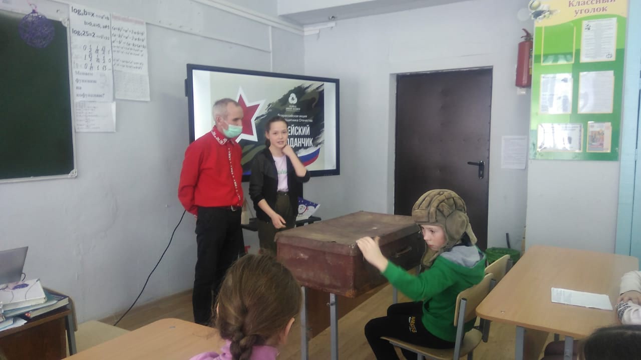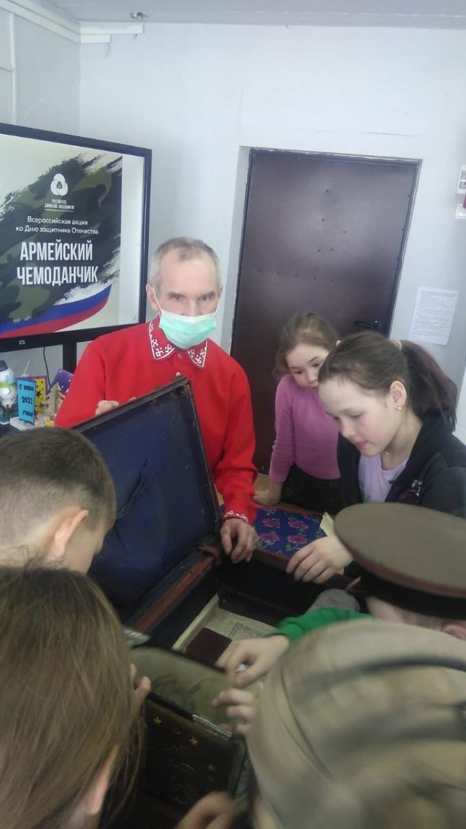 Опубликовано: 22.02.2022В канун Дня защитника Отечества в Бимской школе прошла акция "Армейский чемоданчик", учащиеся 5а класса принесли в школу предметы быта и досуга членов семьи, которые прошли службу, среди вещей были и подлинные вещи и документы участников ВОВ. Все предметы были собраны в настоящий чемодан. В рамках классного часа учащиеся подготовили сообщения о своих защитниках Отечества. На мероприятии принял участие родитель - Корнев Владимир Иванович, который прошёл службу в погранвойсках на границе СССР -Китай. Он рассказал ребятам о своей службе, призвал заниматься спортом, чтоб быть достойным защитником Родины.