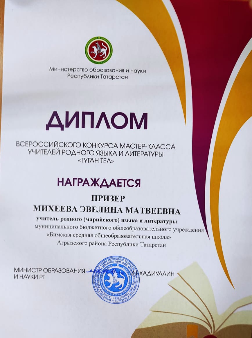 Опубликовано: 08.04.2022В Казани прошёл Всероссийский конкурс мастер классов учителей родных языков. Бимскую школу представляла учитель родного-марийского языка Михеева Эвелина Матвеевна. Её проектная работа на тему "Достопримечательности села Перемен. Туристический путеводитель" получила высокую оценку членов жюри. Эвелина Матвеевна стала призёром данного конкурса. Поздравляем нашего любимого учителя! Мы гордимся Вами.