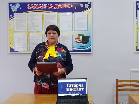 Диктант тексты булып Каюм Насыйриның “Кабуснамә”дән хикәятләр өзеге тәкъдим ителде. Аны туган (татар) тел һәм әдәбият укытучыcы Даутова Әлфинур Фәйзулла кызы укыды.