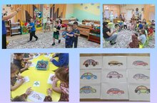 В средней группе продолжается работа по изучению ПДД. Дети рисовали колеса для автомобиля, беседовали о поведении в транспорте, поиграли в подвижную игру и сделали коллаж "Разные машины".