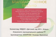 За активное участие в проведении Республиканских и районных природоохранных мероприятий в честь года экологии в РФ, коллектив нашего ДОУ был отмечен Благодарственным письмом Министерства Экологии и природных ресурсов РТ.