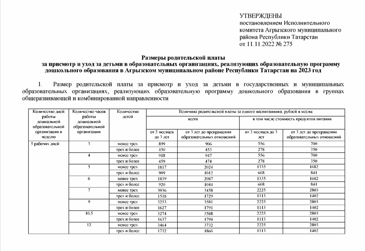 Питание в ДОУ организуется на основе СанПиН 2.3/2.4.3590-20 «Санитарно-эпидемиологические требования к организации общественного питания населения», Федеральным законом «Закон об образовании в Российской Федерации» № 273-ФЗ. Стоимость питания прописана в Постановлении нормативов финансирования деятельности образовательных организаций, реализующие программу дошкольного образования в Агрызском муниципальном районе РТ.