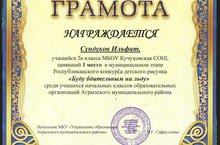 На муниципальном этапе республиканского конкурса детского рисунка "Буду бдительным на льду" среди учащихся начальных классов ученик 2в класса Сундуков Ильфат занял 1 место, Вахитов Ринат ученик 2в класса занял 2 место. (Учитель Багаутдинова Р.Н.) Поздравляем Вас!!!