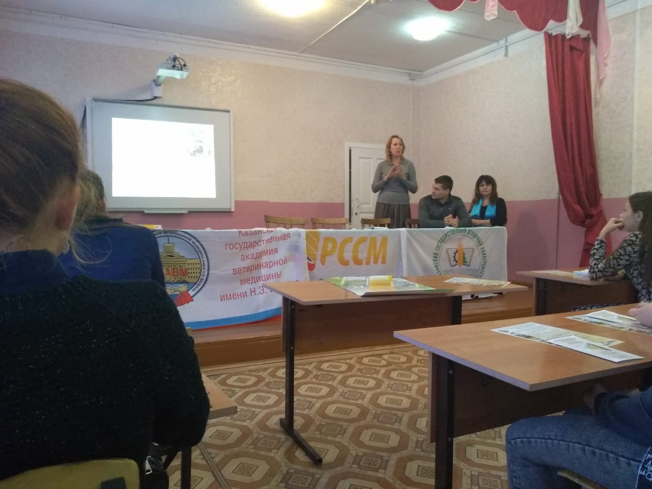 Сегодня, 22 ноября в школе прошла профориентационная встреча учащихся 9-11 классов с преподавателями Казанской государственной ветеринарной академии (КГАВМ) и Казанского государственного аграрного университета (КГАУ). Целью встречи стало повышение престижности аграрных профессий среди учащихся сельской молодежи и информирование сельского населения о существующих мерах государственной поддержки в области развития сельского хозяйства и социального развития сельских территорий.