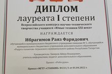 Сегодня пришли результаты Всероссийского конкурса научно - технического творчества учащихся "Юные техники XXI века", в котором наш учащийся Ибрагимов Раяз был награждён дипломом лауреата I степени за проект "Робо - рука". За успешную подготовку обучающегося к мероприятию всероссийского значения также был награждён наш педагог дополнительного образования Закиров Айнур Ильнурович.Поздравляем Вас с очередной победой во всероссийском конкурсе. Желаем всегда оставаться смелым и целеустремлённым человеком, который не боится конкуренции, препятствий и трудностей. Пусть впереди Вас ждут множество чудесных событий и достойных побед!