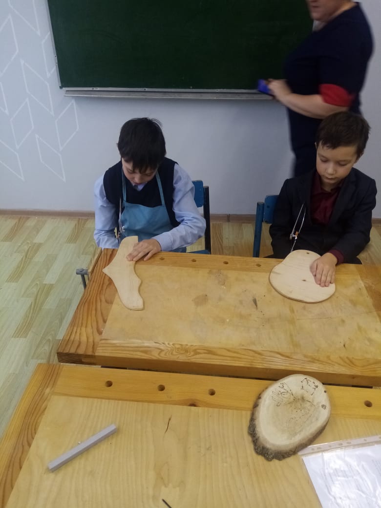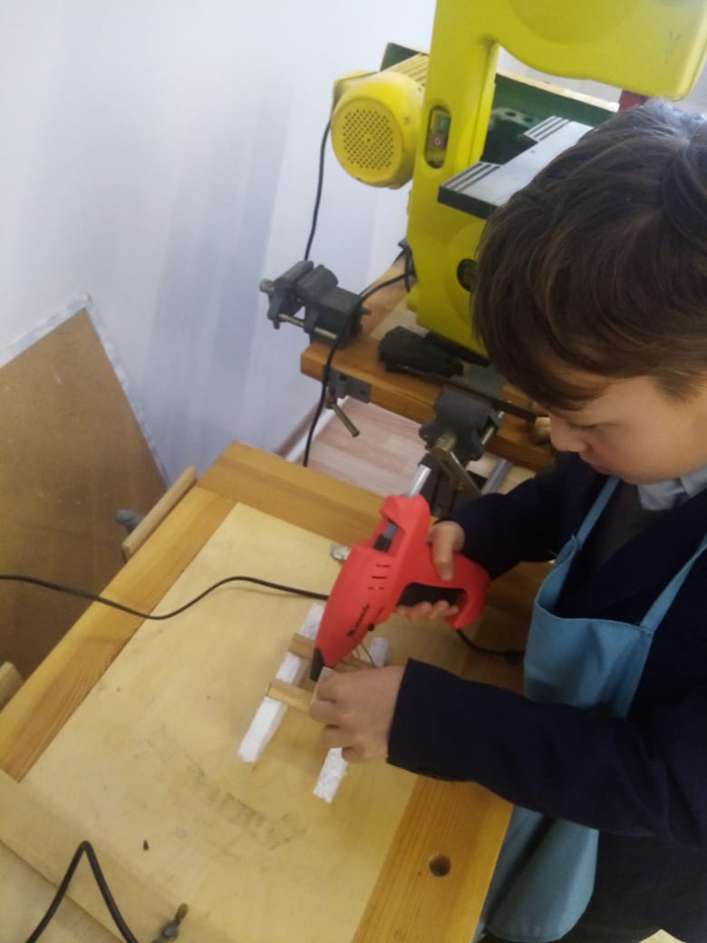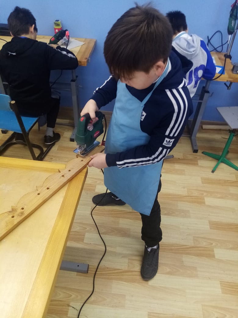 По технологии парни под руководством Салихова М. С. показали мастер-класс того, как научились работать на графированной машине, электролобзике. Показали свои умения работы с клеевым пистолетом, шуруповертом, канцелярским ножом и ручным лобзиком. У ребят уже есть своя командная проектная работа "Теремок для рукодельницы".