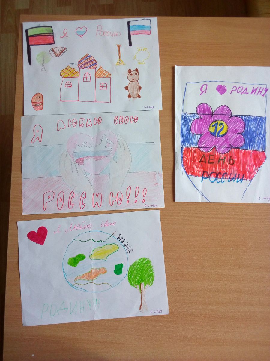 В лагере была организована беседа-викторина «Россия – Родина моя» о символах нашего государства, о происхождении и истории российского герба и флага, о символическом значении цветов флага. Дети раскрашивали шаблоны флага, разгадывали ребусы и кроссворды, провели мини-конкурс «Пословицы о родине», конкурс рисунков на асфальте «День России».