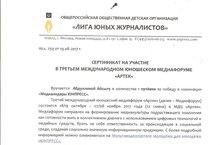 Ученица 11 класса нашей школы Абдуллина Айсылу участвовала в международном юношеском медиафоруме "Артек" и победила в номинации "Медиалидеры ЮНПРЕСС". За победу она награждена путевкой в МДЦ "Артек".
