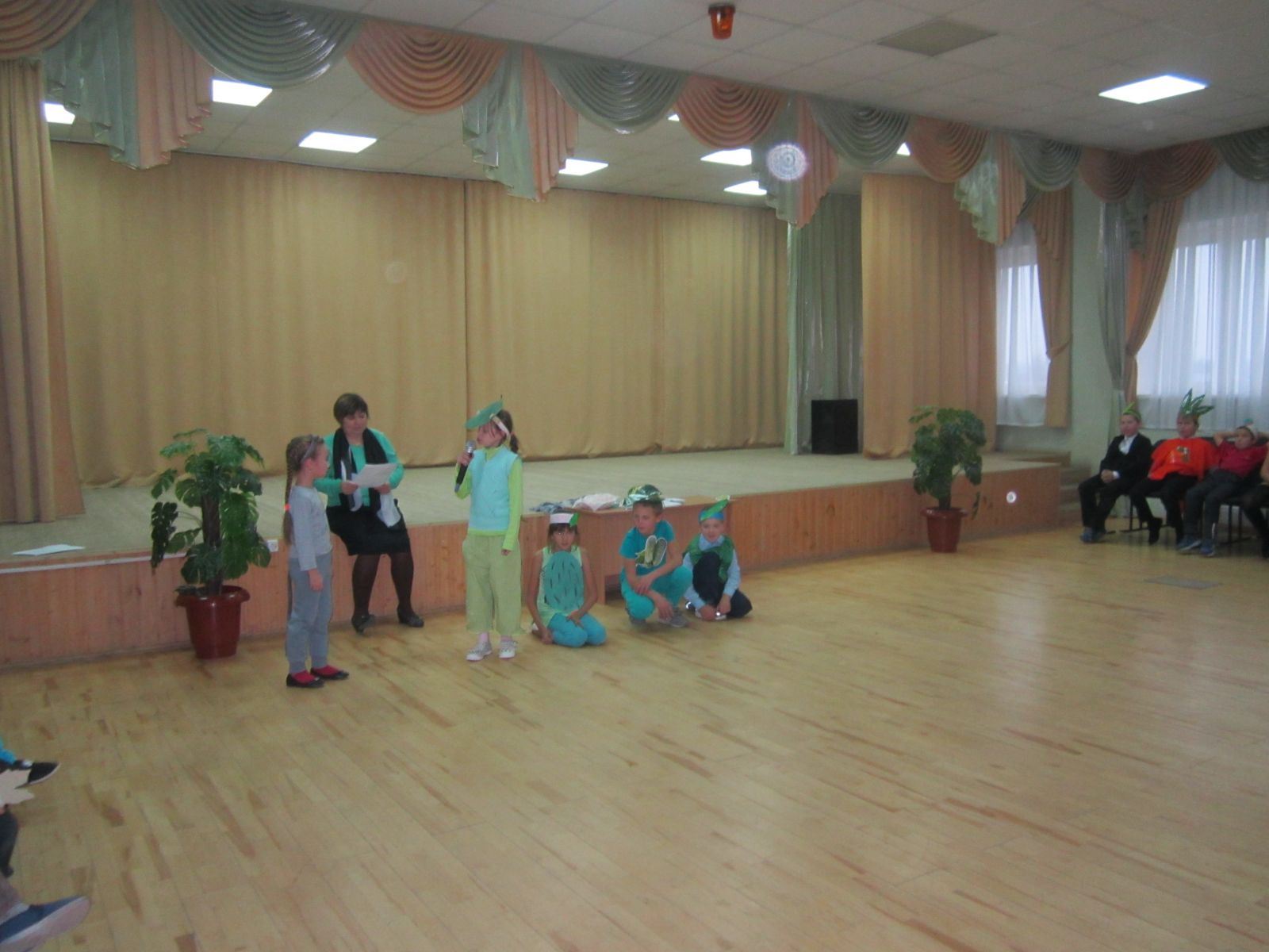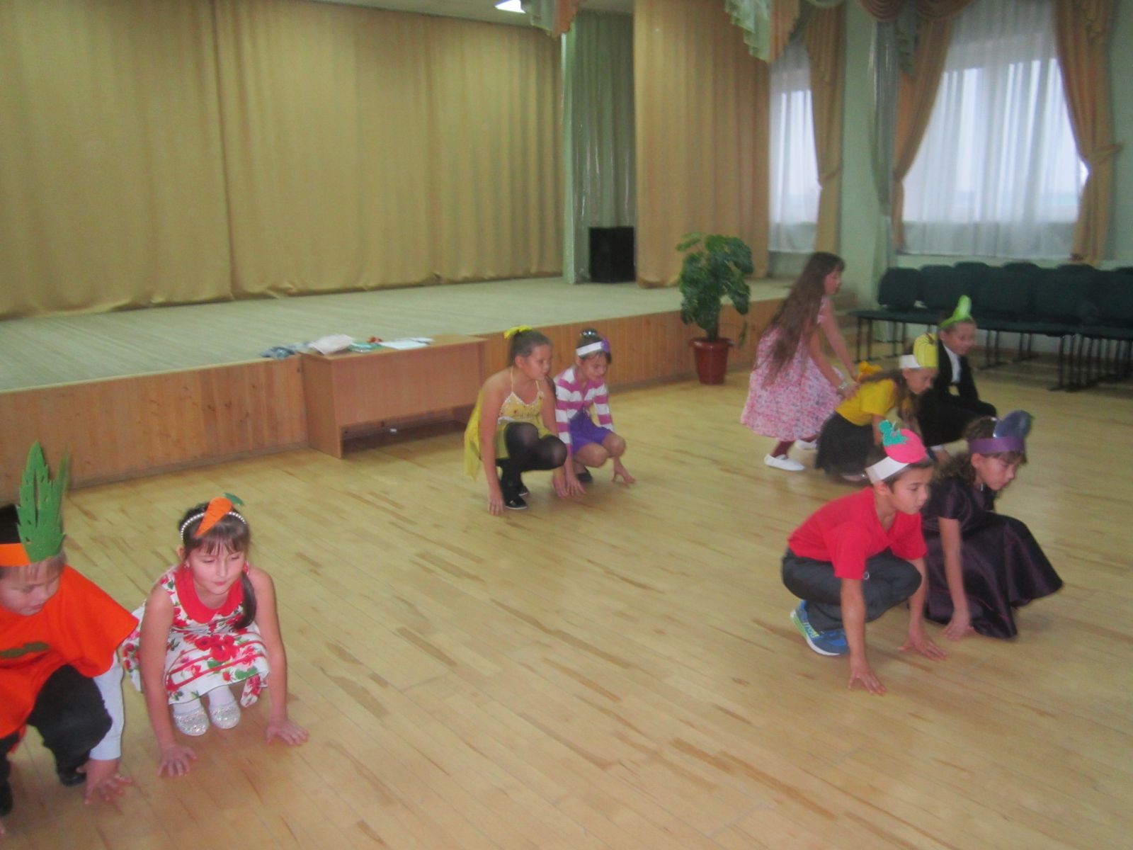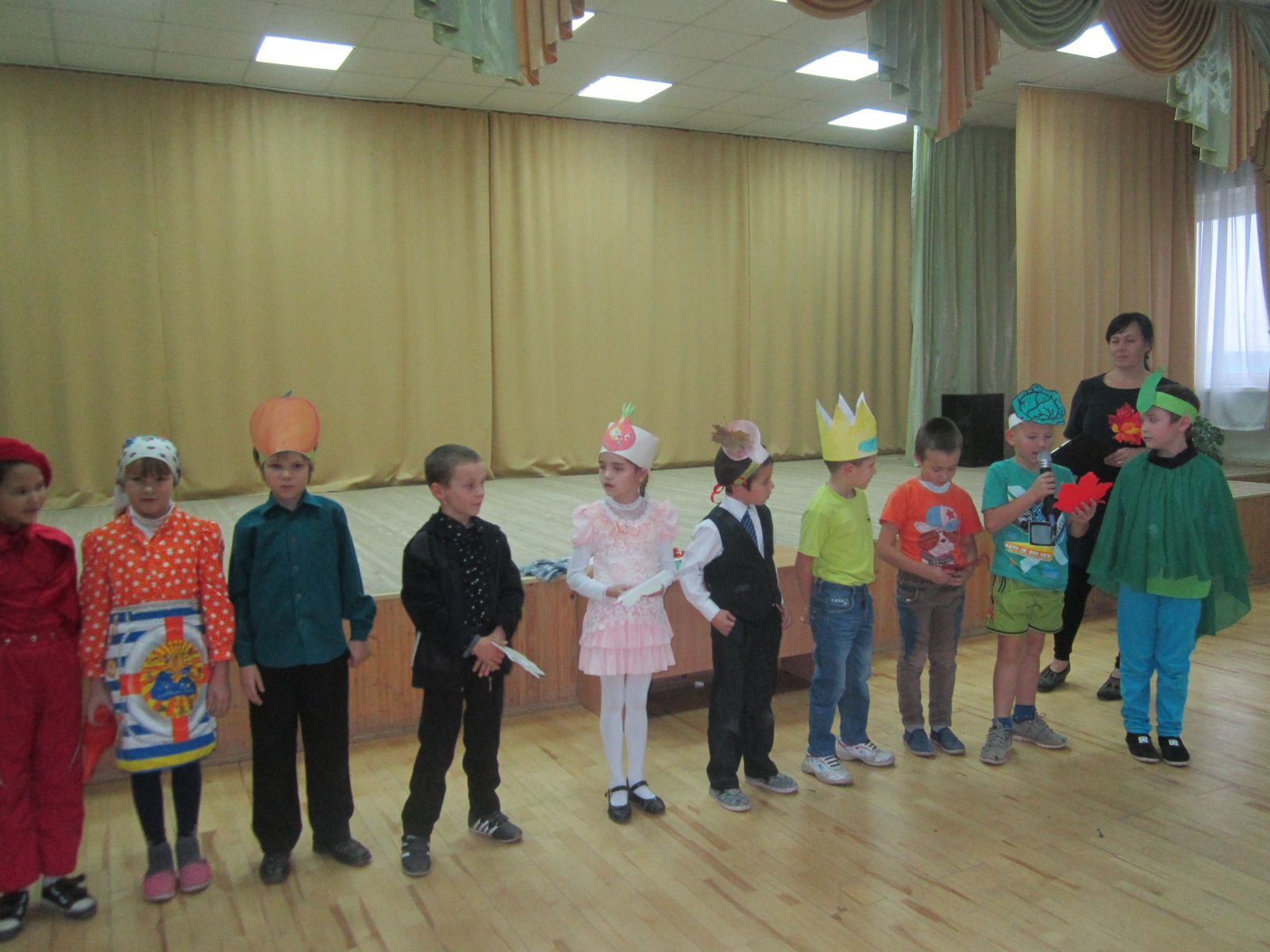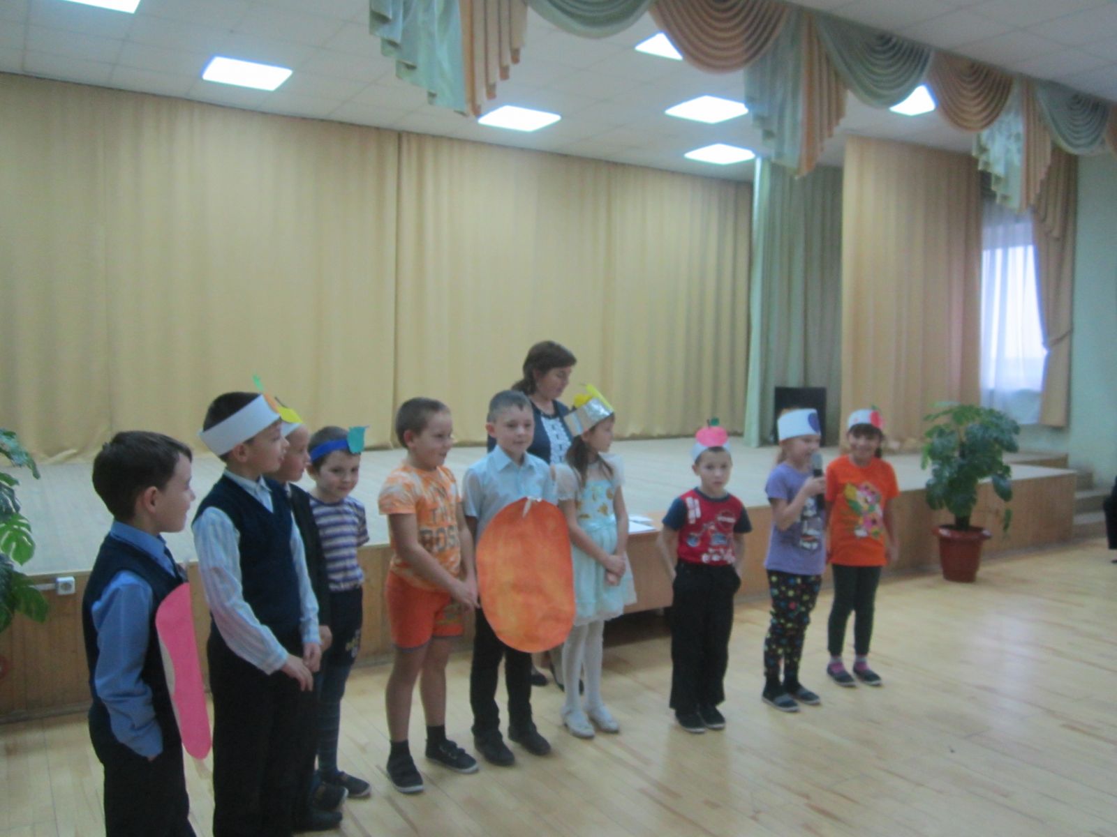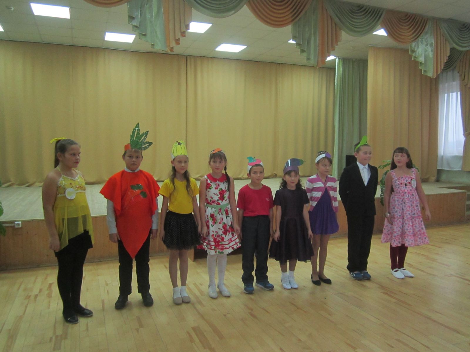 Учащиеся 1-4 классов были одеты в костюмы овощей и фруктов. Они представили свои команды, защитили свои костюмы, выступили со сценками, играли в различные игры. Праздник всем понравился.