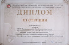 22 августа 2014 года прошло пленарное заседание августовской конференции педагогических работников на тему: " Развитие воспитательного потенциала личности как фактор повышения качества образования", где начальник отдела общего образования и итоговой аттестации обучающихся министерства образования и науки РТ – Ефимов Артур Михайлович, наградил коллектив МБОУ Терсинской СОШ дипломом III степени за победу в зональном этапе в республииканском смотр - конкурсе "Лучшая подготовка образовательных организаций к новому 2014 - 2015 учебному году.
