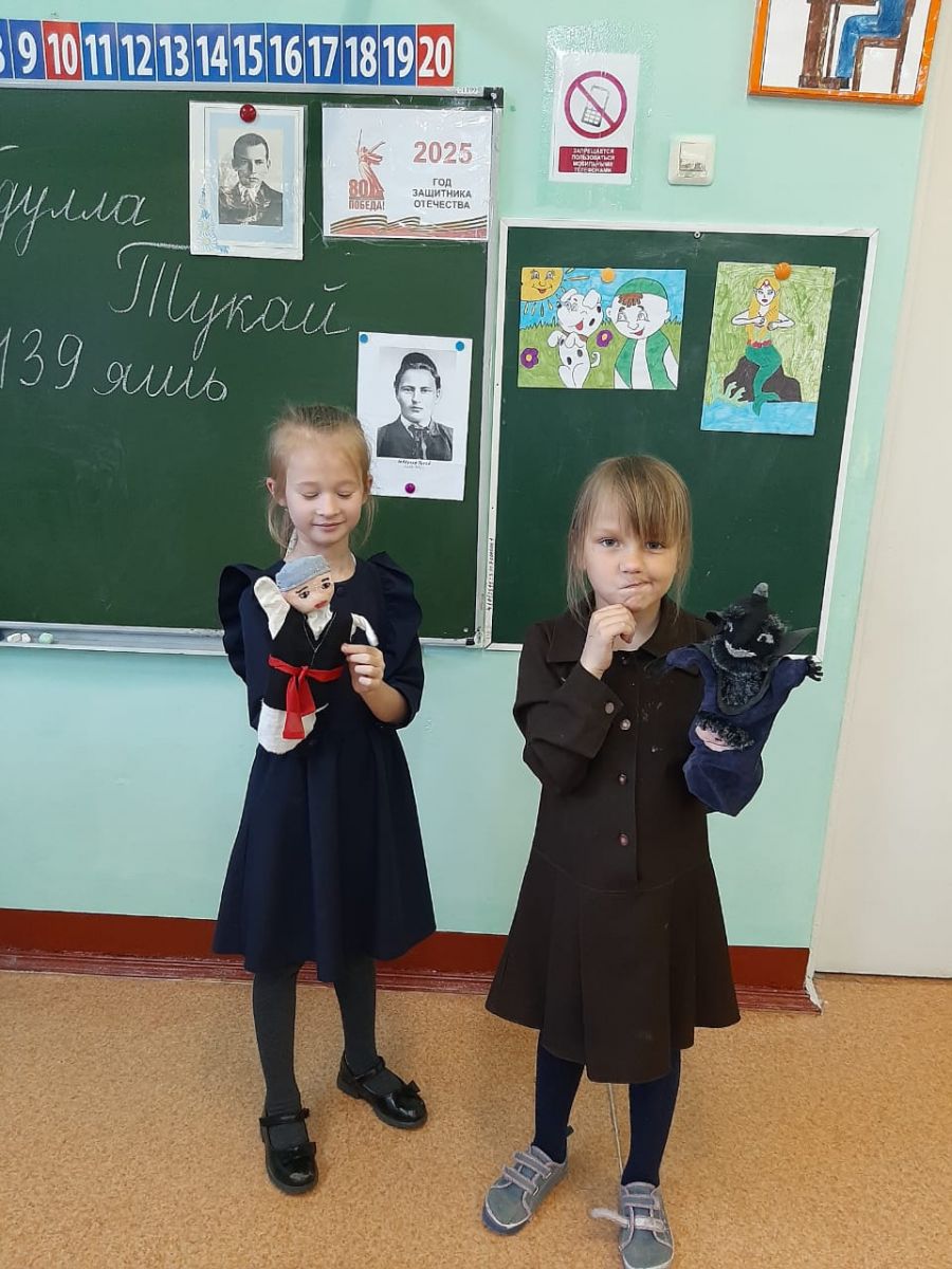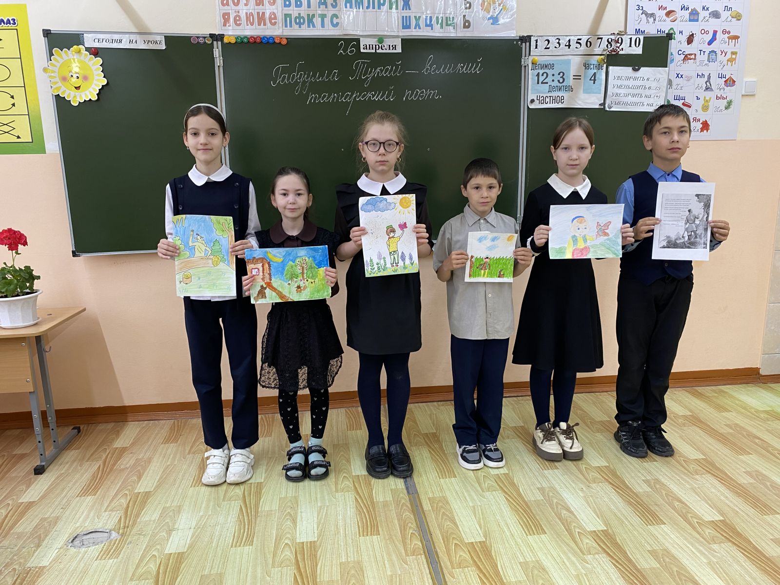 Сегодня в нашем 3 - б классе прошел литературный час, посвященный ко дню рождения татарского поэта Габдуллы Тукая. На мероприятии ученики узнали о нелегком детстве поэта, о его жизни и творчестве. Ребята посмотрели фильм о биографии Габдуллы Тукая. Учащиеся выучили стихи, в которых он затрагивал тему жизни простого народа, родного языка, Родины . Познакомились со сказками – поэмами: «Су анасы», «Шүрәле». Книги Габдуллы Тукая учат детей доброте, красоте родного края, призывают быть милосердным, справедливым и смелым. Викторина «Угадай произведение Г. Тукая по иллюстрации» – пришлась по вкусу учащимся, и они с удовольствием отвечали на вопросы. Была возможность у детей рассказать стихи великого татарского поэта. Впечатлил конкурс рисунков по сказкам-поэмам Габдуллы Тукая. В ходе мероприятия просмотрели мультфильм, созданный по мотивам сказки Г.Тукая«Шүрәле». В конце исполнили песню «Туган тел», которая стала гимном татарского народа.