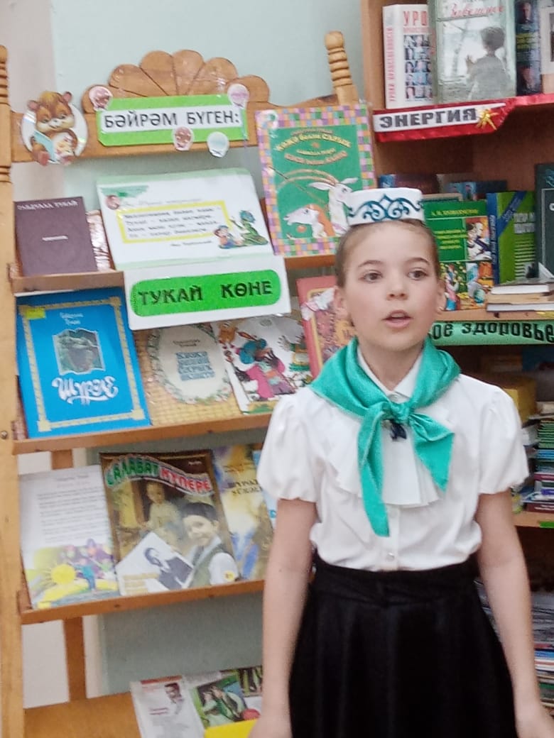 26 апреля мы отмечаем день рождения выдающегося татарского поэта Габдуллы Тукая. В историю развития татарской литературы он вошёл, как великий народный поэт, заложивший основу национальной поэзии и создавший ее классический стиль. 26 апреля в библиотеке прошло мероприятие, посвящённое этому великому татарскому поэту и писателю «Ишеттем мин кичә, берәү жырлый... К мероприятию была оформлена книжная выставка «Я устремляюсь в вечность», где были, представлены сборники стихов и сказок Г. Тукая. Хабибуллина В.А., подробно познакомила детей с биографией Г. Тукая, о его нелёгкой доле и судьбе. Ребята читали стихи Г. Тукая на татарском и русском языках, А в конце праздника хором спели песню «И туган тел, и матур тел!», ставшего гимном татарского народа.