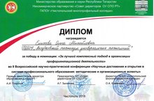 25 апреля состоялась II Всероссийская научно - практическая конференция "Научные достижения и открытия в системе профессионального образования: методические и организационные аспекты" на базе ГАПОУ "Чистопольский многопрофильный колледж". Преподаватель нашего техникума Елисеева Ольга Михайловна приняла участие в работе под названием "Профориентационные практики: опыт профессиональных образовательных организаций". Она подготовила методическую разработку внеурочного мероприятия по профориентации и две презентации: на русском и английском языказх. В результате Елисеева О.М. получила диплом за победу в номинации: "За лучший комплексный подход в организации профориентационной деятельности". Поздравляем!!