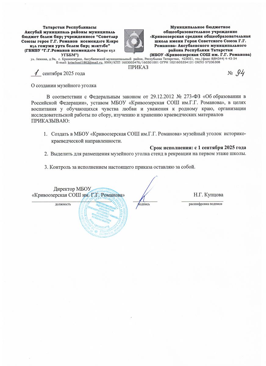 Муниципальное бюджетное общеобразовательное учреждение "Кривоозерская средняя общеобразовательная школа имени Героя Советского Союза Г.Г. Романова" Аксубаевского муниципального района Республики Татарстан/ Татарстан Республикасы Аксубай муниципаль районы муниципаль бюджет белем бирү учреждениесе “Советлар Союзы герое Г.Г. Романов исемендәге Кәкре күл гомуми урта белем бирү мәктәбе”