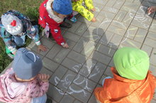 Сегодня в младшей группе прошел конкурс рисунков на асфальте "Под мирным небом". Дети с большим удовольствием рисовали солнышко, цветы, домики, птичек и многое другое.