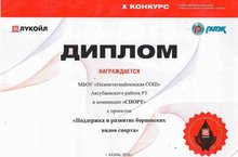 ПАО "ЛУКОЙЛ" РИТЭК оешмасының социаль һәм мәдәни проектлар конкурсының спорт номинациясендә безнең мәктәп "Спортның көрәш төрләрен үстерү" номинациясендә призер булды.