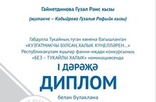 Габдулла Тукайның туган көненә багышланган "Кузгатмакчы булсаң халык күңелләрен.." Республикакүләм яшьләр фәнни - иҗади конкурсының "Без Тукайлы халык" номинациясендә 10 нчы сыйныф укучысы Гайнетдинова Гүзәл Рәис кызы 1 нче дәрәҗә дипломга лаек булды.Котлыйбыз!!! Киләчәктә дә уңышлар телибез!