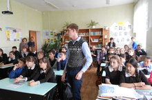 Виктор Юрьевич ( студент Тетюшского педагогического колледжа )проводит урок русского языка в 3 "а" классе по теме: Время глаголов"