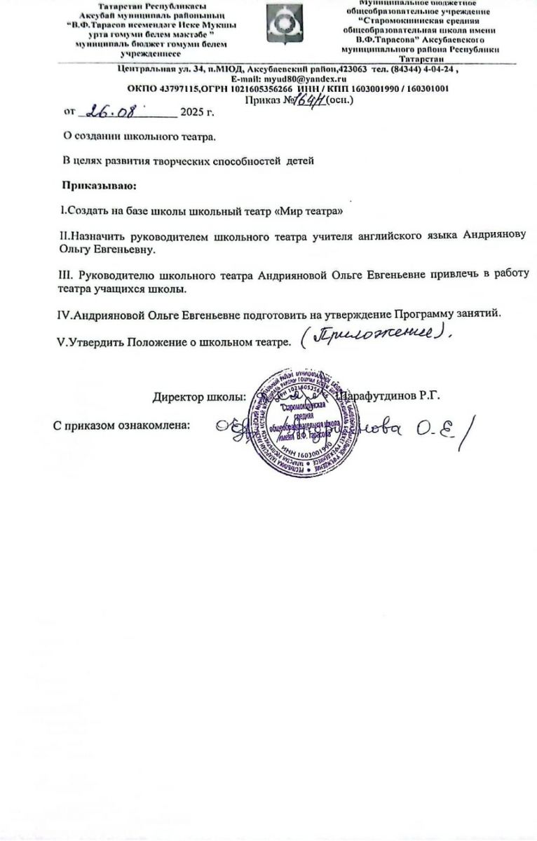 МБОУ «Старомокшинская средняя общеобразовательная школа имени В.Ф.Тарасова" Аксубаевского муниципального района Республики Татарстан / Татарстан Республикасы Аксубай муниципаль районының “В.Ф.Тарасов исемендәге Иске Мукшы урта гомуми белем мәктәбе” Муниципаль бюджет гомуми белем учреждениесе.