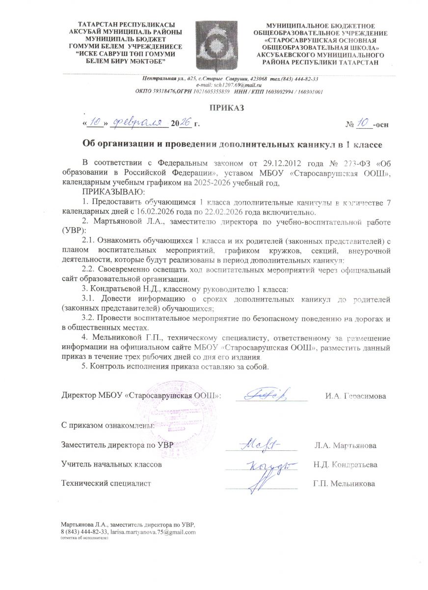 Приказ от 10.02.2026 г. №10-осн "Об организации и проведении дополнительных каникул в 1 классе"