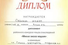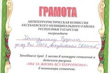 сегодня были подведены итоги районного конкурса "Мы за жизнь без терроризма". Ученица 9а класса Хамидуллина Рузиля заняла 2 место в номинации "Сочинение" (руководитель Вафина Ф.В.). Поздравляем!