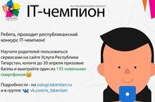 Ребята, проходит республиканский конкурс IT-чемпион! Научите родителей пользоваться сервисами на cайте Услуги Республики Татарстан, копите до 30 апреля призовые баллы и выиграйте один из 135 новеньких смартфонов. Подробности - на uslugi.tatarstan.ru и в группе vk.com/e_tatarstan