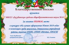 Наша школа стала победителем в муниципальном конкурсе "На лучшее оформление Нового 2019 года" в номинациях "Среди ледяных (снежных) фигур на центральной площади пгт Аксубаево" и "Среди школьных, дошкольных учреждений района, включая ДШИ, СПДП "Мечта", ДЮСШ".
