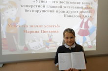 В 4 "А" классе был проведён классный час по теме "Путь к успеху". На котором обсуждались вопросы об успехе и успешности, познакомились с видами внимания ( произвольное и непроизвольное, послепроизвольное ). Классный руководитель Громова О.П. предложила выполнить учащимся несколько упражнений: на развитие внимания, на умение работать по инструкции. Далее учитель провела анкетирование: зачем я хожу в школу? могу ли учиться лучше? Что мне мешает? Могу ли я быть успешным и т.п. В конце классного часа ребята сделали каждый для себя вывод.