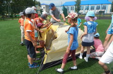 После завтрака пришкольный лагерь "Непоседы" совершил путешествие в сказку "По сказкам А.С. Пушкина". После обеда ребята обучались работе с туристическим снаряжением, учились устанавливать палатки, ориентироваться на местности.