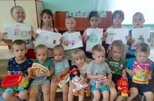 Девочки подарили малышам 4 коллекции бумажных игрушек: роботов, динозавров, зверят, транспорт.