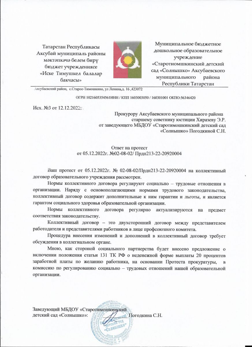 Протест на коллективный договор образовательного учреждения от 05.12.2022г.