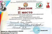 XXI Республиканская НПК имени М.Н.Морякова 25.04.2025 18 апреля 2025 года в г.Лениногорск прошла XXI Республиканская НПК имени М.Н.Морякова, где участвовало 94 участника из разных районов, в том числе Аксубаевский район. Охотникова Ольга, ученица 10 класса Сунчелеевской СОШ , получила диплом 2 степени и ценный подарок. Руководитель - учитель английского языка, Матюкова Н.Н. Наталья Никоноровна стала участником круглого стола педагогов, где представила опыт своей работы.