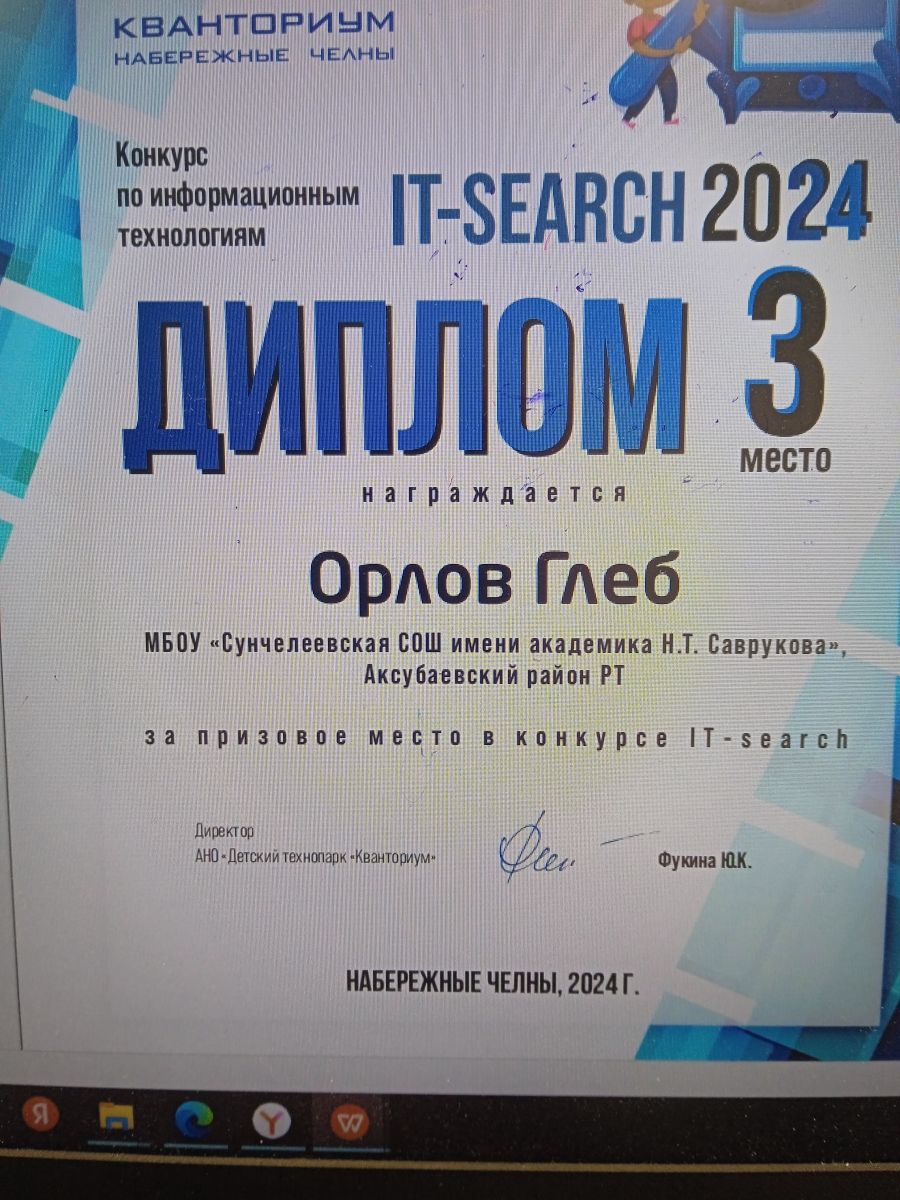 Орлов Глеб занял 3 место в конкурсе по информационным технологиям "IT-SEARCH - 2024" (Кванториум)