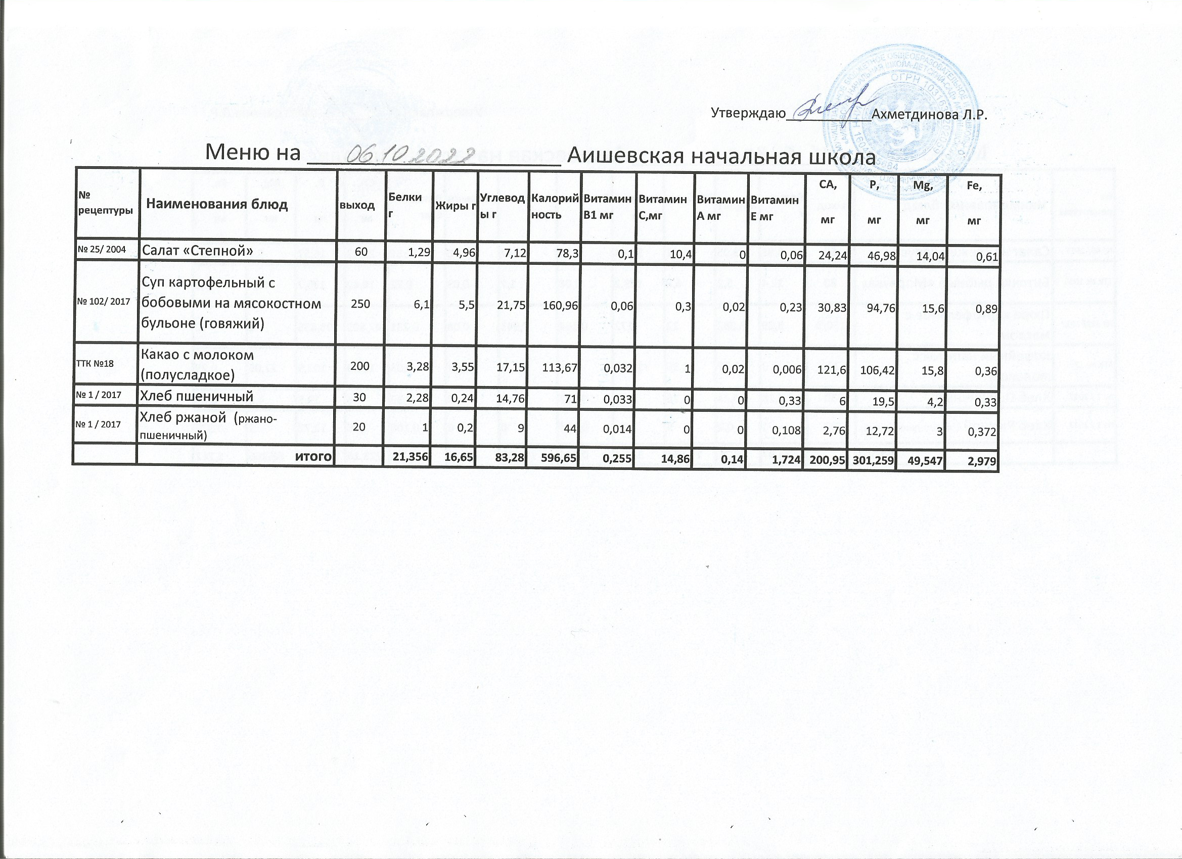 меню на 6 .10.2022