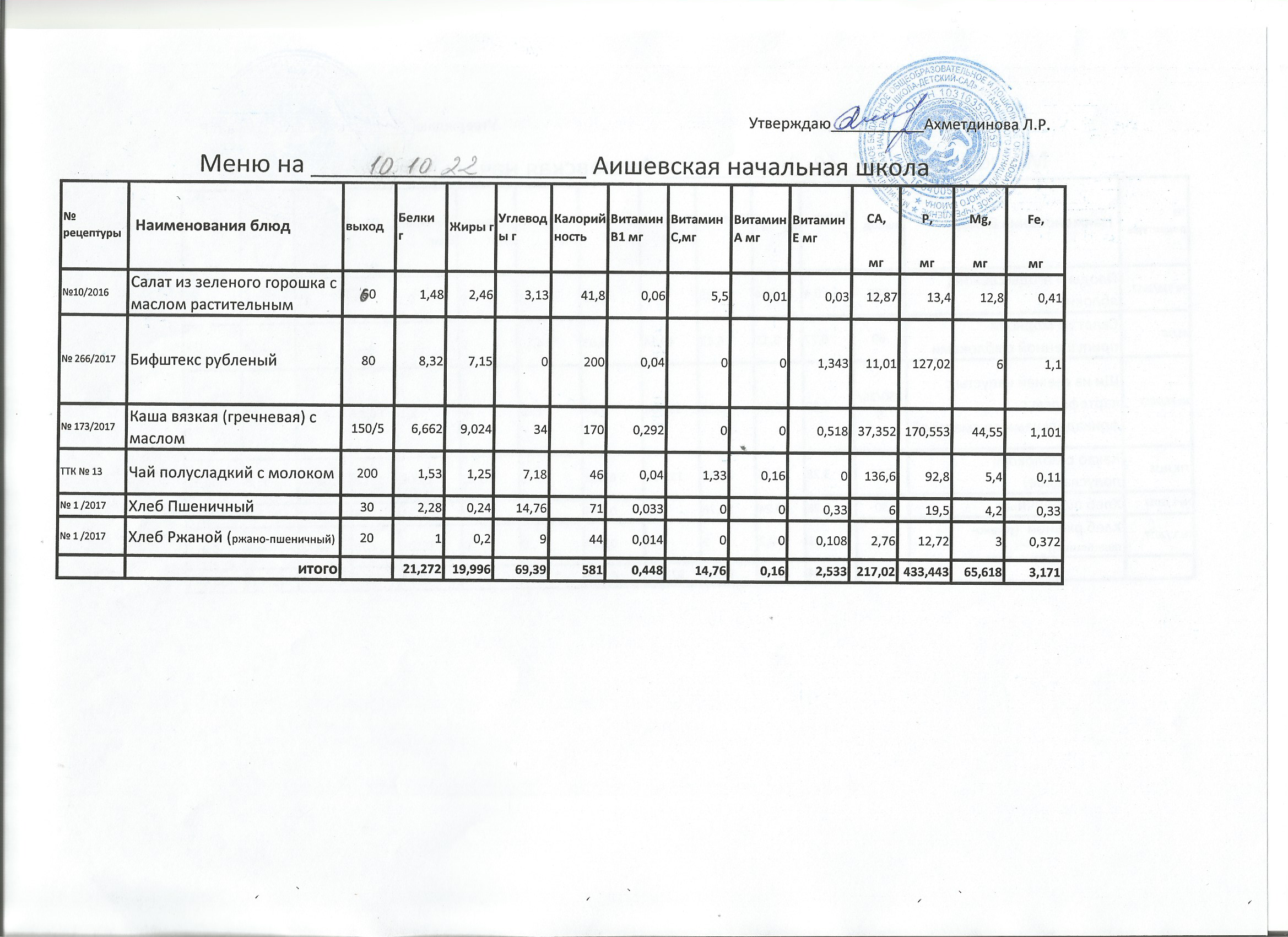 меню на 10.10.2022