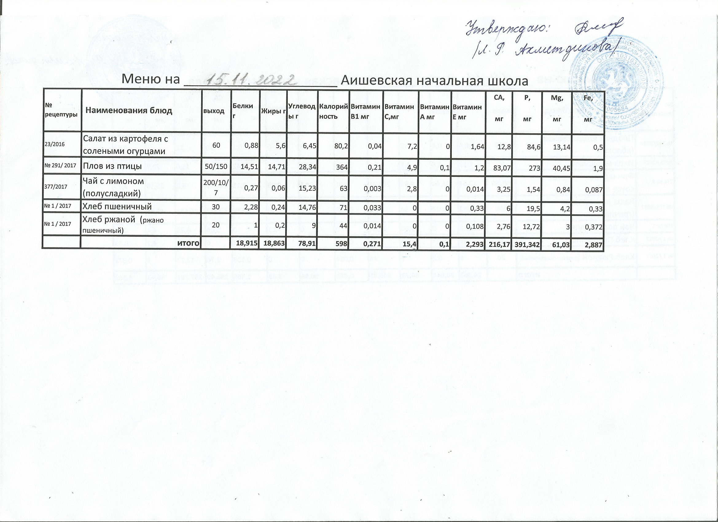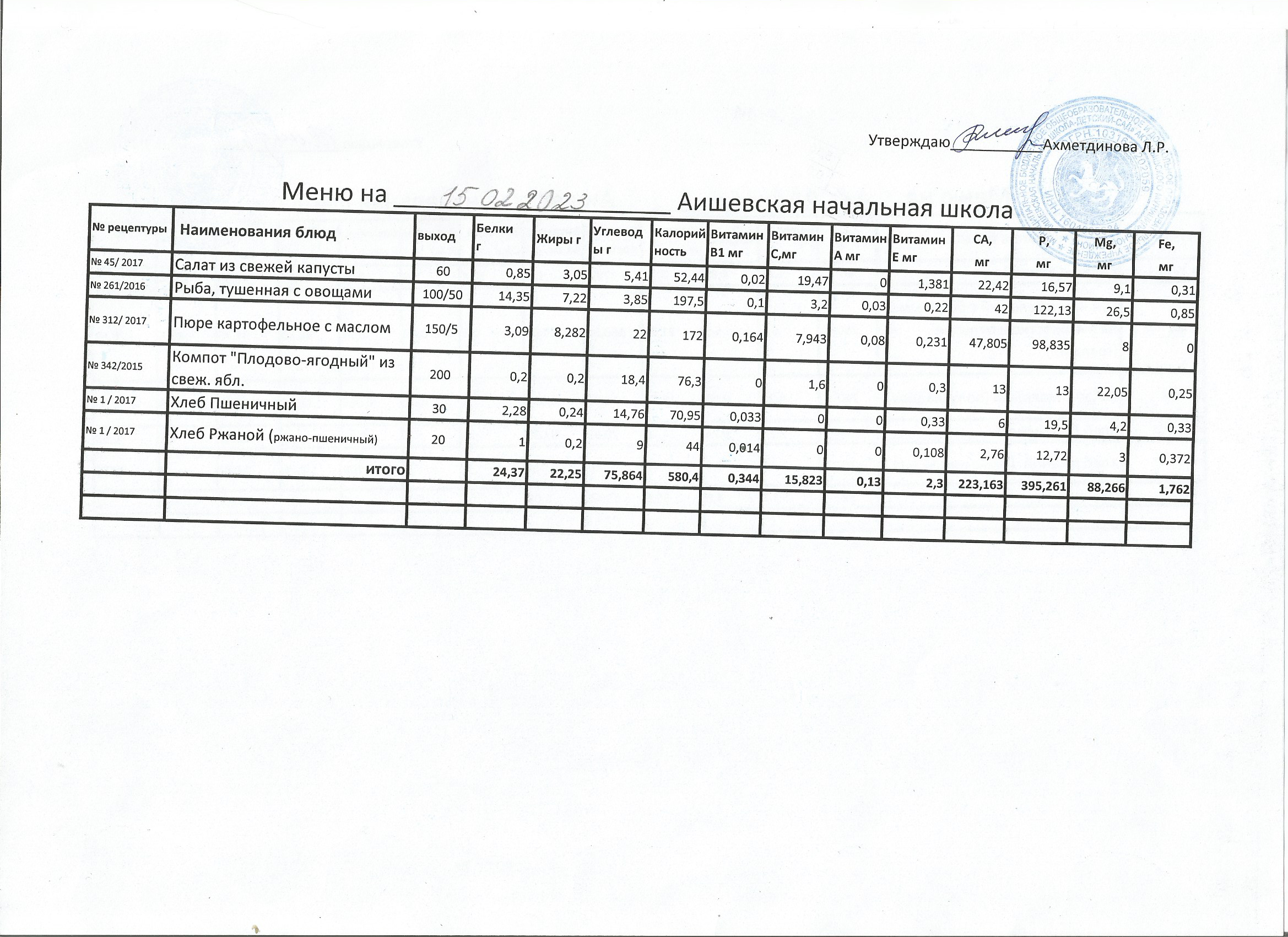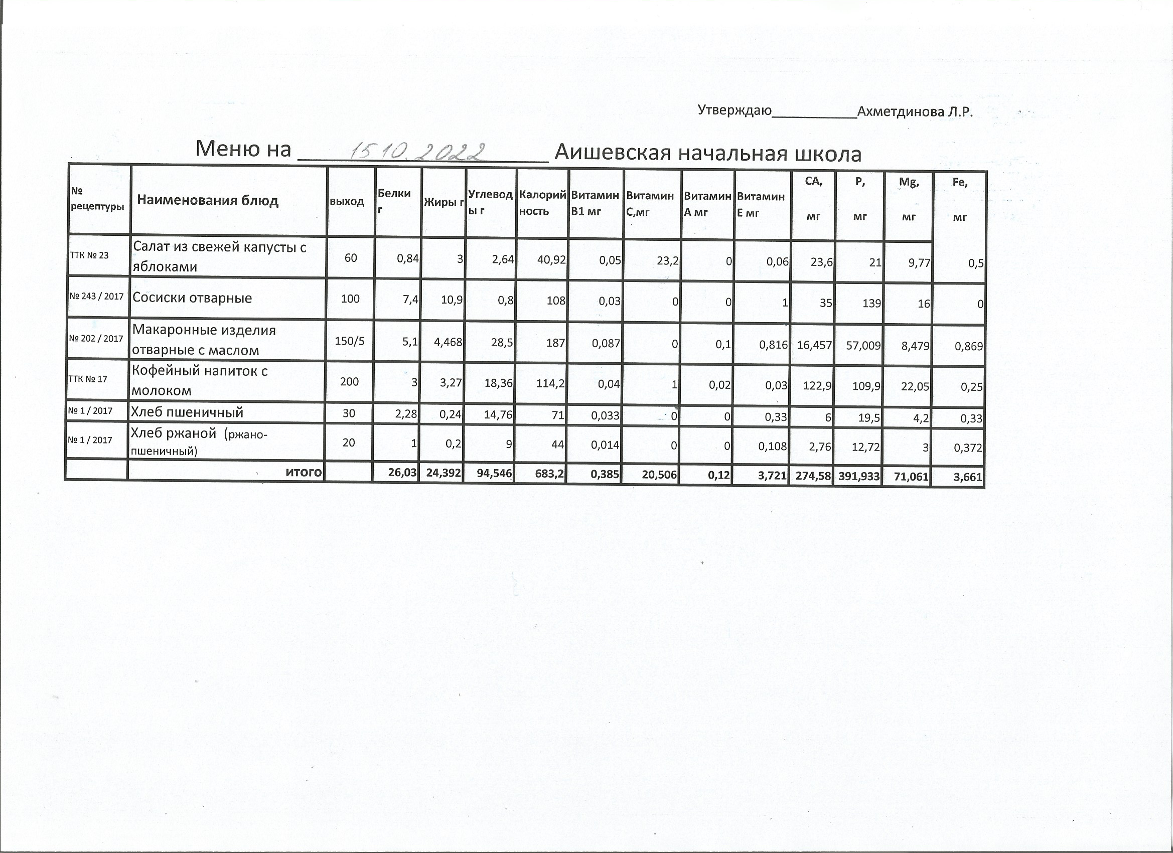 меню на 15.10.2022