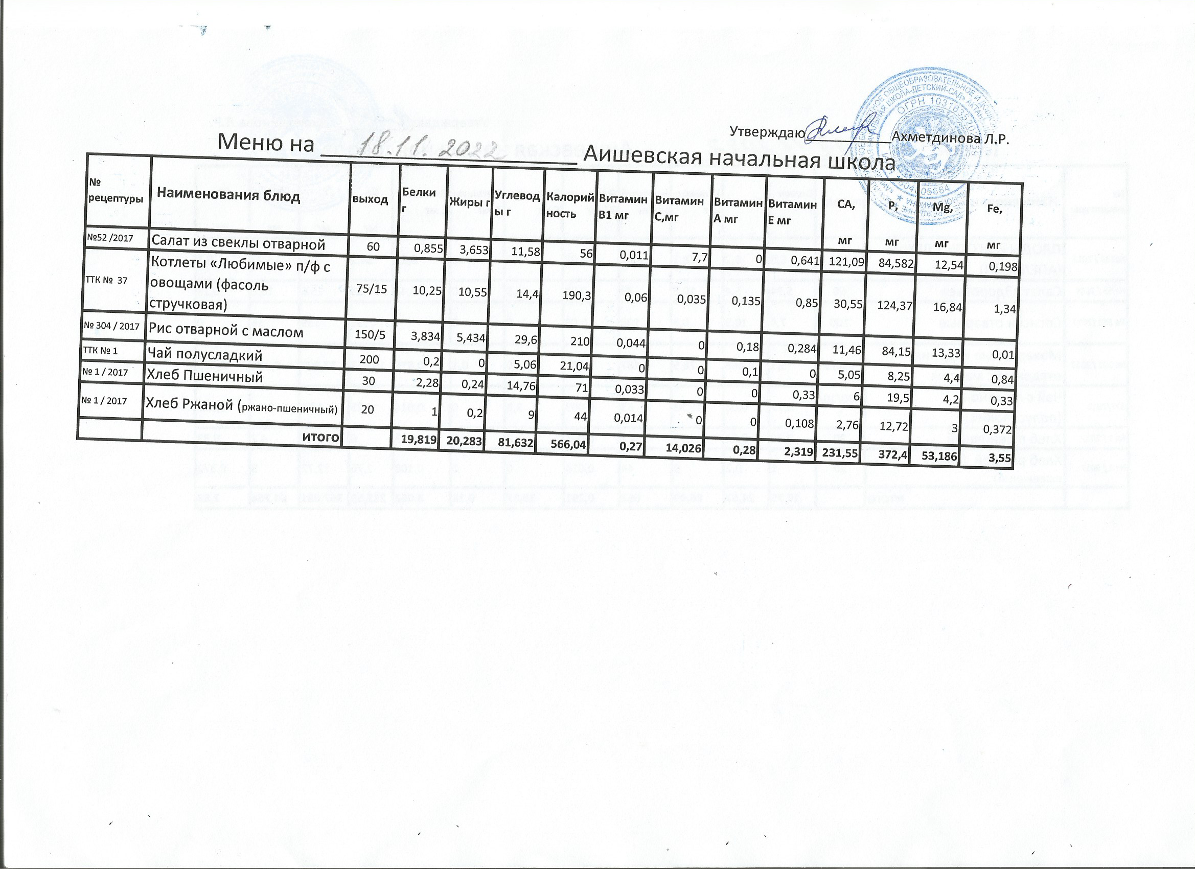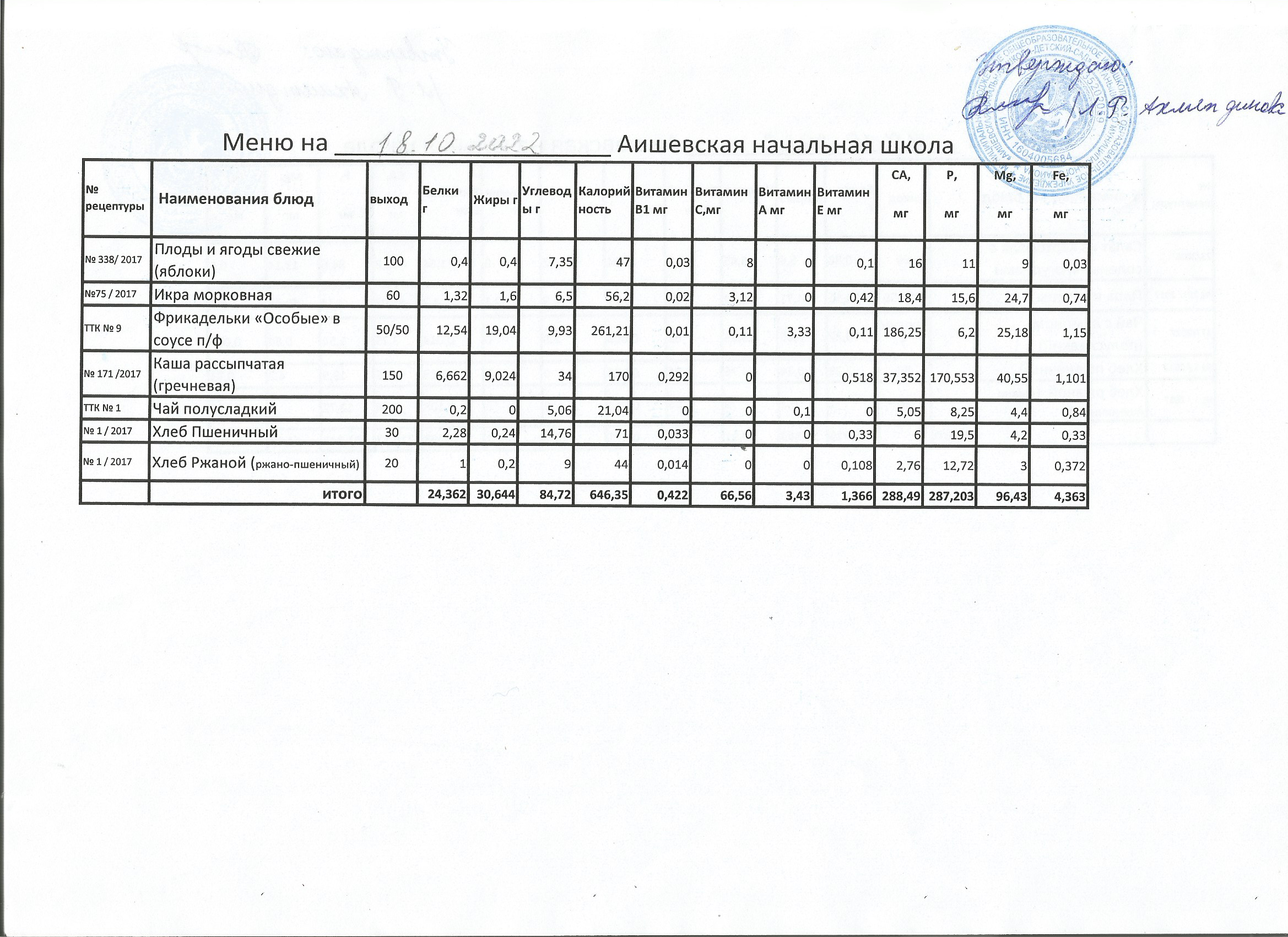 меню на 18.10.2022