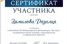 Заместитель директора по ВР Зямилова Розалия Гарифяновна участвовала получила сертификат за участие в юбилейном XV Международном фотоконкурсе "Взгляды", посвященном жизни человека с инвалидностью в современном обществе. Поздравляем!///