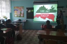 Мәктәптә ТАССРның 100 еллыгын билгеләп үтүнең чираттагы чарасы узып китте. Бу юлы ул класс сәгатьләре формасында узды. Әлеге чаралар Туган тел айлыгы белән бергә үрелеп бара.