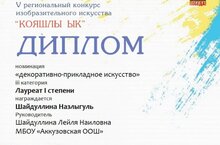 В V региональном конкурсе "Кояшлы Ык" в номинации "Графика" дипломом лауреата I степени награждается Шайдуллин Расимян, в номинации "декоративно- прикладное искусство" дипломом лауреата I степени награждается Шайдуллина Назлыгуль. Руководитель Шайдуллина Лейля Наиловна