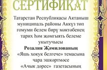 «Ачык дәрес» газетасының №3 (март, 2023) санында Аккүз төп гомуми белем бирү мәктәбенең тарих һәм җәмгыять белеме укытучысы Җәмилова Розалия Гарифҗан кызының «Яшь хокук белгече» темасына чара эшкәртмәсе басылып чыкты.