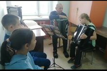Ученики после уроков занимаются в филиале ДО «Детская школа искусств» класс баян. Преподаватель Хазиев Файзелгаян Мурзович.///