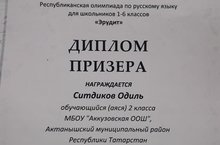 Ученик 2 класса Ситдиков Одиль стал призером на Республиканском олимпиаде по русскому языку для школьников 1-6 классов «Эрудит». Учитель: Хисамова Айсылу Фаритовна. Поздравляем! Желаем дальнейших успехов!///