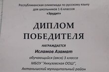3 нче сыйныф укучысы Исламов Азамат 1-6 нчы сыйныф укучылары өчен рус теле буенча «Эрудит» республика олимпиадасында призер булды. Укытучысы Гарипова Э. Ф. Котлыйбыз! Әфәрин!