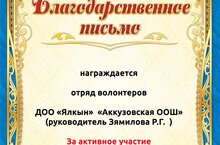 ТР Мәдәният министрлыгының «Ак чәчәк» хәйрия акциясен үткәрү турындагы 8719-04 санлы хаты нигезендә, балалар хәрәкәтен системалы һәм эзлекле үстерү өчен шартлар тудыру, лидерларның һәм мәктәпкәчә белем бирү учреждениеләре җитәкчеләренең инновацион, проект, социаль-белем бирү эшчәнлеген стимуллаштыру максатыннан, «Ак чәчәк» республика хәйрия акциясенең муниципаль этабы үткәрелде. Жюри беркетмәләре нигезендә, Аккүз төп гомуми белем бирү мәктәбенең «Ялкын» волонтерлар отряды «Ак чәчәк» республика хәйрия акциясенең муниципаль этабында актив катнашканы өчен Актаныш «Мәгариф идарәсе»нең Рәхмәт хаты белән бүләкләнде. Педагог-оештыручы: Җәмилова Р. Г.