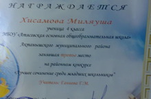 Актанышта узган "Инша язу" конкурсында 4 нче класс укучысы Хисамова Миләүшә өченче урында. Җитәкчесе - Ганиева Г.М. Бу зур җиңү белән кайнар котлыйбыз.